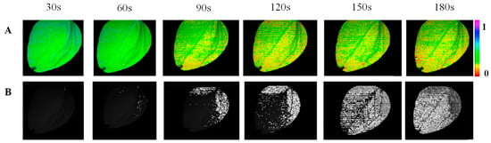 The typical images representing the burn-induced spatio-temporal dynamics of Y (II) in pea leaf: the pseudocolor-coded PAM-images of the same untreated leaf at various time points after the stimulation (A), and a binary representation of the CWT results of the initial images (B). The pixel becomes white if the reaction reaches the point. The time after the stimulation (burn of the first leaf) is indicated.