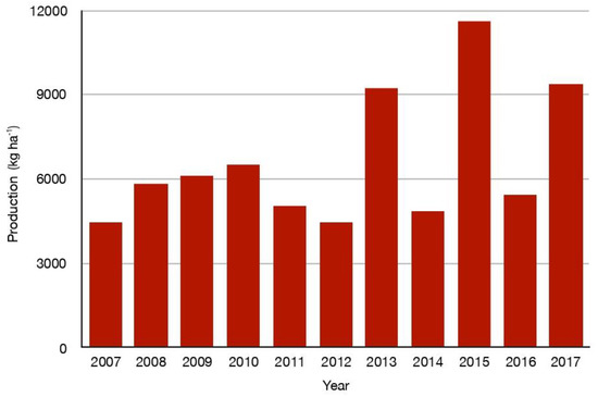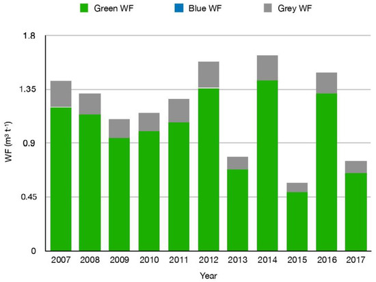 The highest total water footprint values were observed in 2007, 2012, 2014 and 2016, while the lower values were observed in 2013, 2015 and 2017 (Figure 1). The largest component was Green Water while the smallest component was Blue Water. The green component is not directly controlled by the manager and little can be done to reduce green water. However, the grey and blue components (already small in our case) can be reduced with more sustainable agronomic practices.
