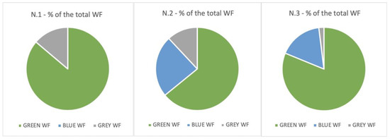 WF types percentages of the total WF in the three compared studies; N.1: Sterpeto, Assisi (PG), Italy, 2019; N.2: Apulia region, Italy [9]; N.3: WaterFootprintNetwork, 2019.