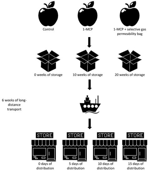 The obtained apples were divided into three groups to assess the influence of the 1-MCP treatment and selective gas permeability packaging, so the experiment included various methods of postharvest treatment: (I) control apples with neither 1-MCP treatment, nor packaging; (II) studied apples after 1-MCP postharvest treatment (SmartFresh ProTabs™, by AgroFresh Solutions Inc., Philadelphia, PA, USA, applied in the concentration of 0.65 µL/L), with no dedicated packaging; (III) studied apples after 1-MCP postharvest treatment (SmartFresh ProTabs™, by AgroFresh Solutions Inc., Philadelphia, PA, USA, applied in the concentration of 0.65 µL/L), with selected gas permeability bags applied (Xtend®, by StePac L.A. Ltd., Tefen, Israel) to provide Modified Atmosphere Packaging (MAP). The 1-MCP treatment was applied directly after harvesting, while MAP bags were applied before simulating long-distance transport, while both chosen 1-MCP treatment [40] and MAP bags are commonly used for fruits [41].
