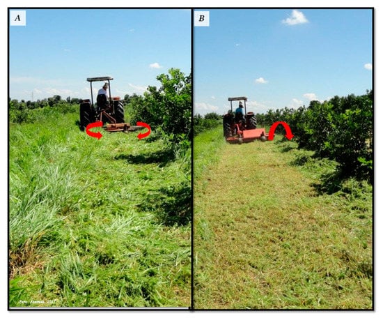The treatments were distributed as follows: the plot represented the two species of tropical Poaceae, U. ruziziensis (RUZ), and U. decumbens (DEC). In the subplots we represented the management of these Urochloa spp., either via a conventional mower (CONV), which cuts the biomass and allows the residue to remain in the inter-row (between citrus rows) area (Figure 1A), or with an ecological mower (ECO), which cuts in the inter-row area and launches the resulting biomass into the intra-row area [] (Figure 1B).
