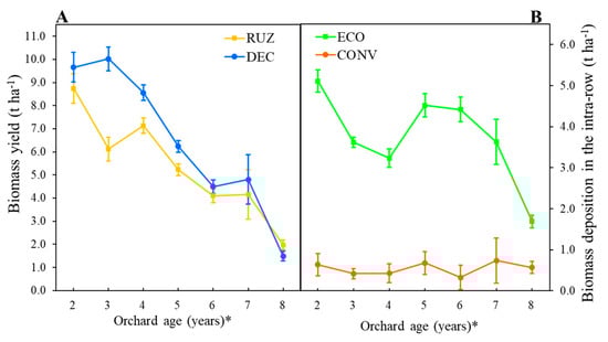 Yield (A) and deposition (B) of biomass from Urochloa spp. in the intra-rows, tested with different cover crops, mowers, and the use of glyphosate. The figures represent the sum of three mowings per growing season (Mogi Mirim, São Paulo, 2012–2019). Legend: RUZ = Urochloa ruziziensis, DEC = U. decumbens, ECO = ecological mower, CONV = conventional mower. The significant difference was accounted for by the Tukey test (p < 0.05), and the error bars represent the minimal significant difference. * Orchard age: 2012–2013 (2), 2013–2014 (3), 2014–2015 (4), 2015–2016 (5) 2016–2017 (6), 2017–2018 (7), and 2018–2019 (8).