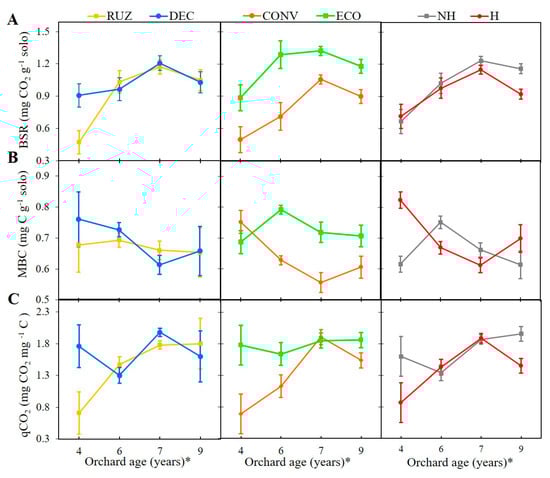 Basal soil respiration, BSR (A), microbial biomass carbon, MBC (B), and metabolic quotient, qCO2 (C), tested with different cover crops, mowers, and the use of glyphosate (Mogi Mirim, São Paulo, 2014–2019). Legend: RUZ = Urochloa ruziziensis, DEC = U. decumbens, ECO = ecological mower, CONV = conventional mower, H = glyphosate herbicide (1080 g ae. ha−1), NH = no herbicide. The significant difference was accounted for by the Tukey test (p < 0.05), and the error bars represent the minimal significant difference. * Orchard age: growing season 2014–2015 (4), 2016–2017 (6), 2017–2018 (7), and 2019–2020 (9).
