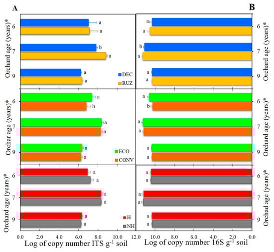 Abundance of the fungal gene ITS (A) and bacterial 16S RNA (B) from the rhizosphere of Tahiti acid lime plants tested with different cover crops, mowers, and the use of glyphosate (Mogi Mirim, São Paulo, 2016–2019). Legend: RUZ = Urochloa ruziziensis, DEC = U. decumbens, ECO = ecological mower, CONV = conventional mower, H = glyphosate herbicide (1080 g ae. ha−1), NH = no herbicide. The significant difference was accounted for by the Tukey test (p < 0.05), and the error bars represent the minimal significant difference. * Orchard age: growing season 2016–2017 (6), 2017–2018 (7), and 2019–2020 (9).
