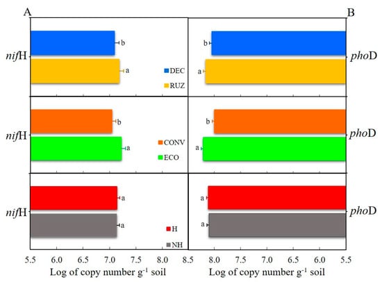 Abundance of the nitrogen fixer enzyme gene, nifH (A) and alkaline phosphatase, phoD (B) from the rhizosphere of Tahiti acid lime plants tested with different cover crops, mowers, and the use of glyphosate (Mogi Mirim, São Paulo, 2019). Legend: RUZ = Urochloa ruziziensis, DEC = U. decumbens, ECO = ecological mower, CONV = conventional mower, H = glyphosate herbicide (1080 g ae. ha−1), and NH = no herbicide. The significant difference was accounted for by the Tukey test (p < 0.05), and the error bars represent the minimal significant difference.