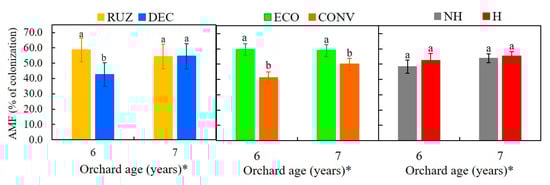 Percentage of colonization by arbuscular mycorrhizae fungal (AMF), tested with different cover crops, mowers, and the use of glyphosate (Mogi Mirim, São Paulo, 2016–2017). Legend: RUZ = Urochloa ruziziensis, DEC = U. decumbens, ECO = ecological mower, CONV = conventional mower, H = glyphosate herbicide (1080 g ae. ha−1), NH = no herbicide. The significant difference was accounted for by the Tukey test (p < 0.05), and the error bars represent the minimal significant difference. * Orchard age: growing season 2016–2017 (6) and 2017–2018 (7).