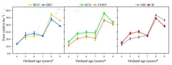 Orchard fruit yields for different cover crops, mowers, and the use of glyphosate (Mogi Mirim, São Paulo, 2014–2019). Legend: RUZ = Urochloa ruziziensis, DEC = U. decumbens, ECO = ecological mower, CONV = conventional mower, H = glyphosate herbicide (1080 g ae. ha−1), NH = no herbicide. The significant difference was accounted for by the Tukey test (p < 0.05), and the error bars represent the minimal significant difference. * Orchard age: growing season 2014–2015 (4), 2015–2016 (5), 2016–2017 (6), 2017–2018 (7), and 2019–2020 (9).