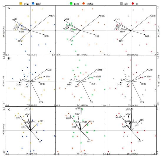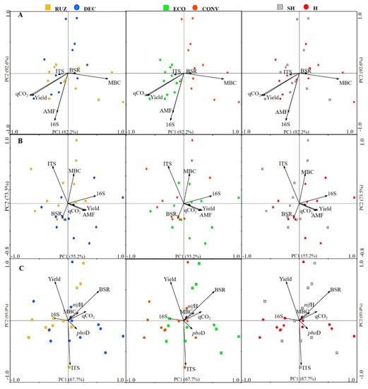 The redundancy analysis (RDA) correlated the environmental variables of basal soil respiration, microbial biomass carbon, metabolic quotient, mycorrhizal colonization, abundance of genes 16S, ITS, nifH, phoD, and the yield of Tahiti acid limes with the bacterial (Figure 8A–C) and fungal (Figure 9A–C) community in the different treatments.