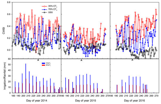 Average daily crop water stress index (CWSI) and irrigation applications to deficit irrigated treatments in 2014, 2015, and 2016. Computed CWSI of the well-watered vines (WW) is shown for reference. The ^ symbol denotes veraison day of year.