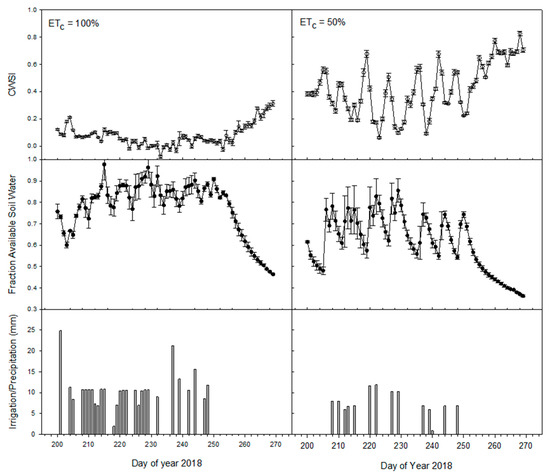 Crop water stress index (CWSI), fraction available soil water, and irrigation applications to treatments in 2018. Bars represent ± standard error of the value.