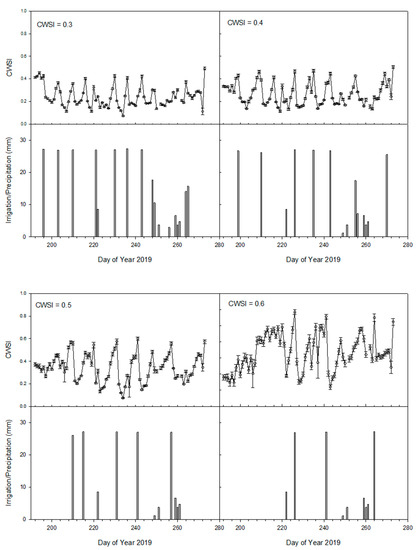 Treatment plots contained three adjacent vine rows with six vines per row (18 vines per plot). The vines located in the outer rows of each plot were considered buffers and data were collected on interior vines in the center row. In the first four study years, irrigation treatment amounts were evapotranspiration-based and applied weekly from fruit set until harvest with 70% or 35% of ETc in 2014, 2015, and 2016 and with 50% or 100% ETc in 2018. In 2014, 2015, and 2016, each replicate block was applied the same irrigation treatment in each subsequent year and border vines located on the trial perimeter were maintained under well-watered conditions by supplying >100% ETc. Weekly ETc was calculated by multiplying the value for alfalfa reference ETr, acquired from a weather station located within 3 km of the study site (http://www.usbr.gov/pn/agrimet/wxdata.html), by Kc that increased during the growing season from 0.3 to 0.7 [6,29]. In 2019, different daily CWSI threshold values (0.3, 0.4, 0.5, or 0.6) were used to trigger an irrigation event of 28 mm. Each year, all plots were irrigated to field capacity prior to bud break and there were no subsequent irrigations until the irrigation treatments were initiated after fruit set, when berries were ~7 mm in diameter and vines were at growth stage 31 of the modified E-L grapevine growth stage system [30].