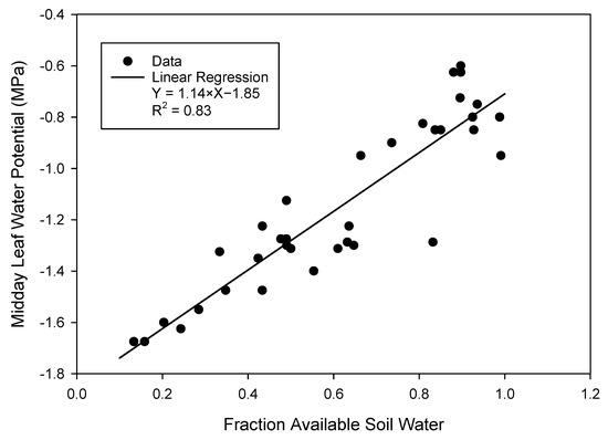 Relationship between the fraction available soil water and midday leaf water potential for Malbec in 2018.