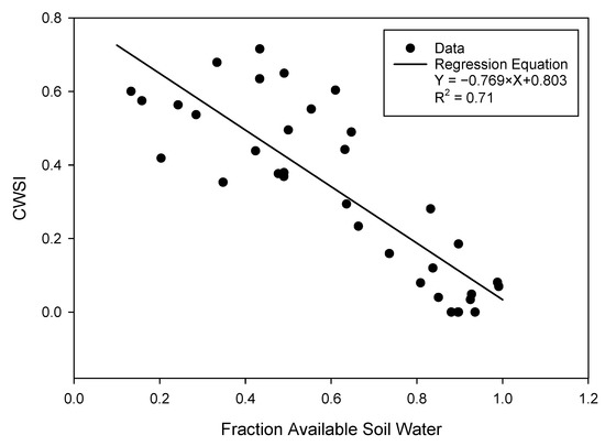 Relationship between the fraction of available soil water and crop water stress index (CWSI) in 2018.