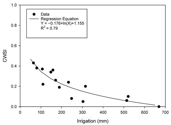 Over the 5-year study, a significant linear relationship (p < 0.001) was observed between Ψlmd and the daily CWSI (Figure 4), ASW and Ψlmd (Figure 5), and ASW and the daily CWSI (Figure 6). A significant logarithmic relationship (p < 0.001) was observed between the amount of irrigation/precipitation supplied between the fruit set and harvest and the average daily CWSI (Figure 7). The seasonal average daily CWSI increased as irrigation/precipitation between the fruit set and harvest decreased.