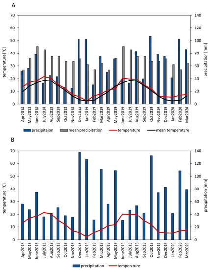 The mean annual precipitation at the experimental site is 840 mm with a mean temperature of 10.3 °C. A comparison of the weather of the experimental years compared to the long-term mean (1981–2010) at the nearby weather station from the German Meteorological Service at Cologne Bonn Airport (Figure 1A) shows a dry summer and autumn in 2018 (July until November), a dry summer in 2019 (June and July) and shift of precipitation towards winter (December 2018, January 2019, February and March 2020). In 21 out of 24 months it was warmer in the experimental years compared to the long-term mean. The weather records in the experimental field (Figure 1B) are comparable to the weather data from the weather station at the Cologne Bonn Airport with dry summers and wet winters.
