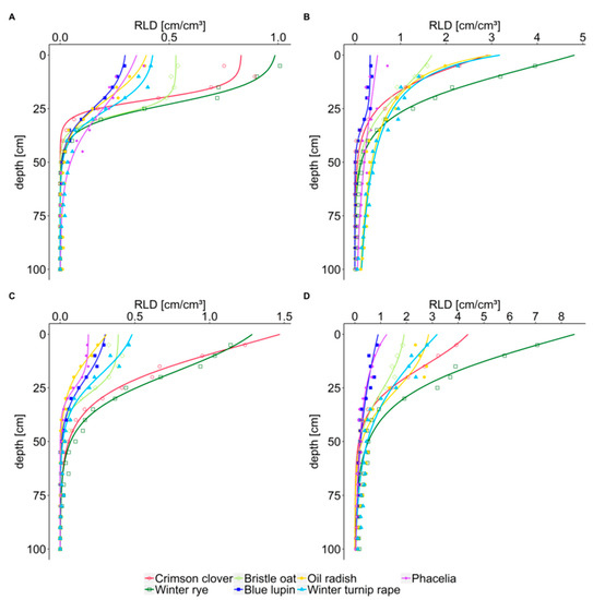 Root length density (RLD) of cover crops at different soil depth before winter (A,B) and after winter (C,D) in seasons 2018/2019 (A,C) and 2019/2020 (B,D). RLD was fitted by a non-linear regression using a three-parameter logistic function. Estimated parameters are shown in Table S1. Symbols show the means of the measured values (n = 3).