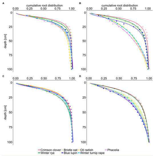Wendling et al. [20] gave detailed information on root traits of a wide range of cover crop species. However, root traits were analysed only until 50 cm soil depth and no function was used to illustrate the distribution of RLD by soil depth. Some information on RLD profiles can be found in Bodner et al. [21] for phacelia, rye, mustard and hairy vetch, and in Vos et al. [22] for winter rye and forage rape. Both studies used an exponential function for distribution of RLD by depth. However, they only examined RLD until 40 cm and 60 cm soil depth, respectively. To describe the exploration of the total soil volume, the cumulative root distribution of the RLD of different cover crops is of interest. In a meta-study, Fan et al. [23] modified a logistic dose-response curve for cumulative root distribution by depth for agricultural crops and showed different root distributions for different types of agricultural crops. However, cover crops were not included.