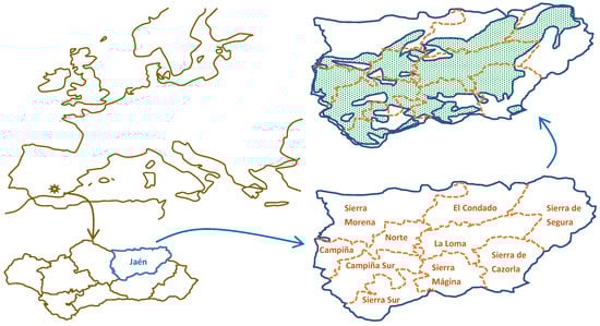 Spain has 2.5 million hectares of olive groves [44], with 60.80% being located in Andalusia (1.5 × 106 ha; [45]). The province of Jaén represents 23.12% (578,000 ha; [46,47]) of this production with respect to Spain and 38.53% with respect to Andalusia [45]. In turn, the surface extension is distributed over nine agricultural areas (Figure 1): La Loma (108,739 ha), Campiña Norte (98,054 ha), Campiña Sur (85,015 ha), Sierra Sur (66,754 ha), El Condado (56,018 ha), Sierra Mágina (46,178 ha), Sierra de Cazorla (42,515 ha), Sierra de Segura (41,431 ha), and Sierra Morena (33,218 ha).