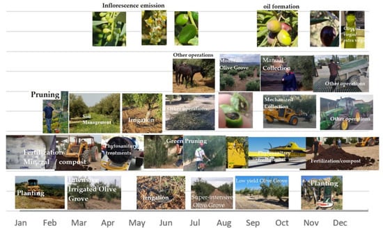 Figure 2. Agricultural tasks during a year (olive grove). Also, cultivation systems. - Soil Management: The use of herbicides, brush cutting (if necessary, manual or mechanized with a tractor), in addition to tasks to prepare the soil for harvesting (Figure 2). Likewise, this can be manual or mechanized. The use of herbicides, if applicable, is mainly in spring and autumn. The management of the vegetal layer, especially in ecological production, can be done by grazing (a diente). Also, mechanical clearing.
