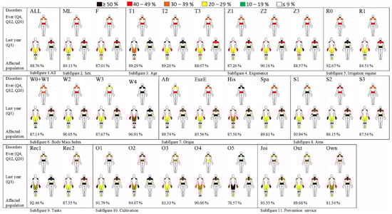 Ailments at some time during the last twelve months. Subfigure 1: All; Subfigure 2: Sex; Subfigure 3: Age; Subfigure 4: Experience; Subfigure 5: Irrigation regime; Subfigure 6: Body Mass Index: Subfigure 7: Origin or nationality; Subfigure 8: Area; Subfigure 9: Tasks; Subfigure 10: Cultivation; Subfigure 11: Prevention service. Abbreviations: Please see Table 3 and Table A1—Appendix A.