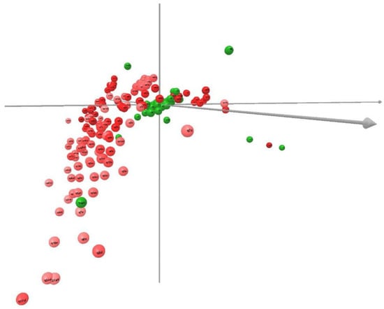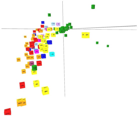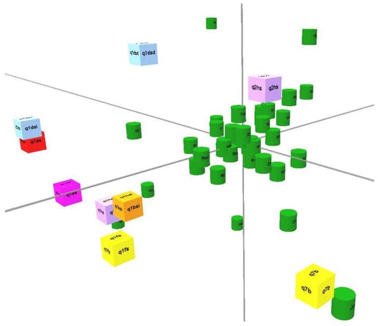Likewise, the multiple correspondence model performed allows one to identify the categories of each variable that most discriminate the objects, these being the most important. For this, the variables are quantified and represented graphically (Figure 4). In the Figure 4 (see video), the green spheres represent the individual categories and the red spheres represent the different questionnaire categories (being less frequent for the less-intense red). In the labels, one can read the codes for each category.