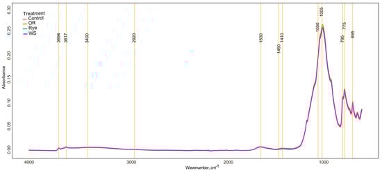 After drying, the soil samples were crushed by hand between 1 and 5 min in an agate mortar. The soil functional groups were determined by Thermo-Nicolet iS10 Fourier Transform Infrared Spectrophotometer (FTIR, Thermo Fisher Scientific, Waltham, MA, USA). The data was collected at a 4 cm−1 resolution over a range of 4000 to 400 cm−1. For each sample, 32 scans were performed in three repetitions. Spectra replicates were corrected against the spectrum for ambient air as background, and the automatic baseline correction was applied. Peak heights were obtained using OMNIC software (Nicolet Instruments Corp., Madison, WI, USA). Relative absorbance was measured following the procedure described in Gerzabek et al. []. The parameters (base1/peak/base2) chosen for each peak were as follows: 3000/2920/2800, 1740/1630/1495, 1495/1410/1320, and 1320/1005/825. The relative absorbance was calculated by dividing the height of a distinct peak by the total sum of all peak heights. The soil spectra from the FTIR analyses are represented in Figure 1. The results show two peaks, at 3694 and 3617 cm−1, which are associated with O–H stretching in kaolinite []. The same O–H bond specific for carboxyl and hydroxyl groups was also found in this region, at 3400 cm−1 []. The peak at 2920 cm−1 is due to the asymmetric C–H vibration of aliphatic compounds, also known as the hydrophobic component []. Further along the soil spectra, the hydrophilic component at 1630 cm−1 can be seen, which represents the aromatic C = C and C = O vibrations of amide I groups []. The next band, at 1410 cm−1, is characteristic of C–O bond vibrations as well as vibrations in C–N (amide III) [,]. The sharp peak at 1005 cm−1 corresponds to the Si–O–Si stretching of silicates and clay minerals as well as the C–O–C stretching of polysaccharides []. Three other peaks in the soil samples were found at 795, 775, and 695 cm−1, which are due to Si–O bonds in quartz material [].