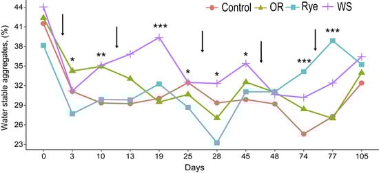 The evolution of water-stable aggregates in each of four treatment conditions over a 105-day incubation period: soil only (Control), soil mixed with oilseed rape residues (OR), soil mixed with rye residues (Rye), and soil mixed with wheat straw (WS). Arrows indicate the water addition events. Stars indicate significant differences between treatments within the same day according to one-way ANOVA (* p < 0.05, ** p < 0.01, and *** p < 0.001).