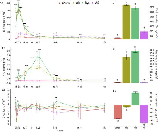 Evolution of CO2 (A), N2O (B), and CH4 (C) flux (mean ± standard error) and average final cumulative flux in each of four treatment conditions over a 105-day incubation period (D), (E), (F): soil only (Control), soil mixed with oilseed rape residues (OR), soil mixed with rye residues (Rye), and soil mixed with wheat straw (WS). Stars indicate significant differences between treatments within the same day according to one-way ANOVA (* p < 0.05, ** p < 0.01, and *** p < 0.001). The different letters represent significant differences between treatments according to Tukey’s HSD test.