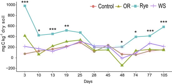 The microbial biomass carbon (MBC) evolution in each of four treatment conditions over a 105-day incubation period: soil only (Control), soil mixed with oilseed rape residues (OR), soil mixed with rye residues (Rye), and soil mixed with wheat straw (WS). Stars indicate significant differences between treatments within the same day according to one-way ANOVA (* p < 0.05, ** p < 0.01, and *** p < 0.001).