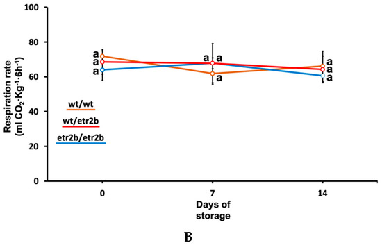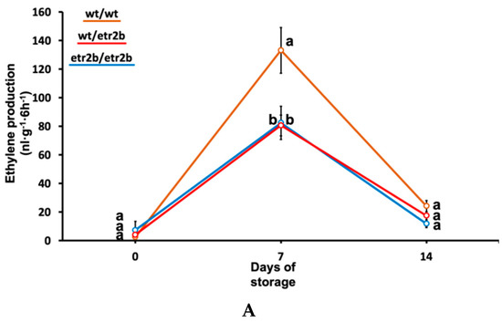 Evolution of ethylene (A) and CO2 (B) in WT (wt/wt) and heterozygous (wt/etr2b) and homozygous (etr2b/etr2b) mutant fruits. Fruit was stored for 0, 7, and 14 days at 4 °C and then rewarmed at 20 °C for 6 h before measurements. The results represent the mean of four independent replicates for each sample. Different letters indicate significant differences between genotypes for each storage time (p-value < 0.05).