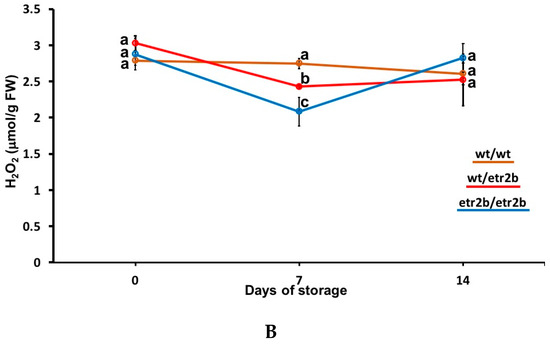 The content of H2O2 in the fruit exocarp of the different genotypes was also very similar throughout the storage period, but after 7 days of cold storage, statistical differences were found between the H2O2 content of the WT and etr2b mutant fruit. The reduction in ethylene production after 7 days of cold storage in the homozygous etr2b/etr2b fruit, was therefore associated with a diminution of the of H2O2 content (Figure 4). As expected, the heterozygous wt/etr2b fruit, whose plants have an intermediate sensitivity to ethylene [14,15], showed an intermediate content of H2O2 at 7 day of cold storage, with respect to the WT and the homozygous mutant fruits (Figure 4).