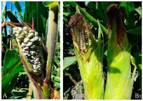 - Du-Toit, L.; Pataky, J. Effects of silk maturity and pollination on infection of corn ears by Ustilago maydis. Plant Dis. 1999, 83, 621–626. [Google Scholar] [CrossRef]