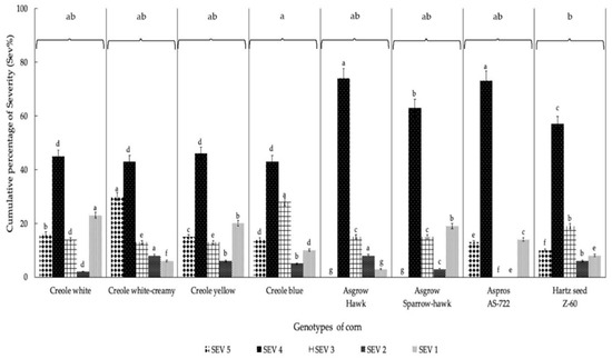 Accumulated degrees of severity (expressed as percentages) of infection of the U. maydis strain MA-Um1 for each genotype of corn in Nopalucan, Puebla, Mexico. Means followed by the same letter are not significantly different (p ≤ 0.05) according to Tukey’s test.