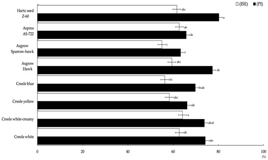 The most representative degree of severity obtained for the eight corn genotypes was grade 4 (Figure 2), which ranged between 43% and 74%, including 182 plants for the Asgrow Hawk genotype and 43 plants for Creole blue, respectively, obtaining significant differences (p = 0.004). Regarding the percentage incidence (PI), there were statistically significant differences (Figure 3) between the eight corn genotypes. The highest PI was obtained for the Hartz seed genotype Z-60 (82.25%), followed by Asgrow Hawk, Creole white, and Creole creamy-white, although not presenting significant differences between them (p = 0.62). However, the genotype with the lowest incidence percentage was Asgrow Sparrow-hawk (63.31%), followed by AS-722 (65.8%) and the Creole yellow and Creole blue genotypes (66.2 and 69.8%, respectively).
