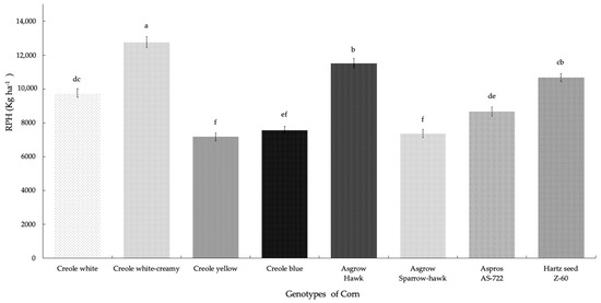For the potential yield per hectare (RPH), there were highly significant differences between the treatments (p = 0.001), where the Creole creamy-white genotype showed higher production (12,759.21 Kg ha−1), presenting 75% of first quality galls. The Asgrow Hawk hybrid was characterized by generating the second highest production, with 73% of first quality galls. The lowest production was presented for the Creole yellow genotype (7167.8 Kg ha−1), representing 20% of SEV1 plants (plants without the presence of galls). We can see that the yields for the eight genotypes of corn range from 7167.8 to 12,759.21 Kg ha−1 (Figure 4); however, if we consider the average yield between the hybrid and Creole genotypes, the overall group of hybrid genotypes presented 50.64% higher yields than the yields presented by the overall group of Creole genotypes (49.35%).