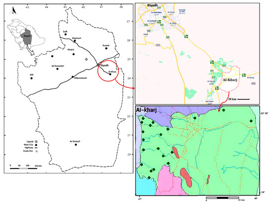 Map of Saudi Arabia showing the study area (Al-Kharj). The studied sites are shown with green circles (●).