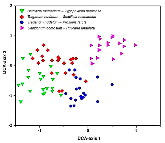 The classification of stands by cluster analysis led to recognition of four vegetation groups that ordinated on DCA with the following indicator species: vegetation group-I (VG-I), Seidlitzia Rosmarinus—Zygophyllum hamiense; VG-II, Traganum nudatum—Seidlitzia rosmarinus; VG-III, Traganum nudatum—Prosopis farcta; and VG-IV, Calligonum comosum—Pulicaria undulata (Figure 2).