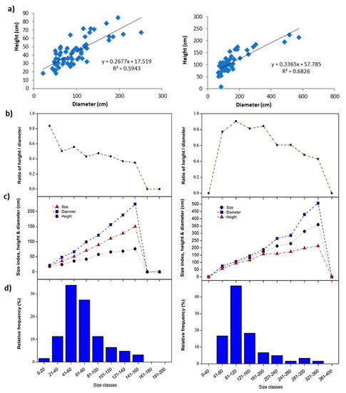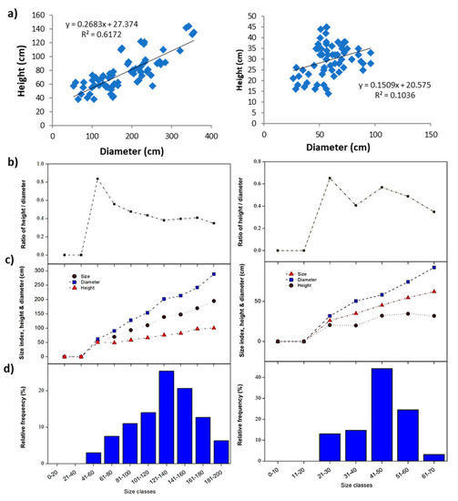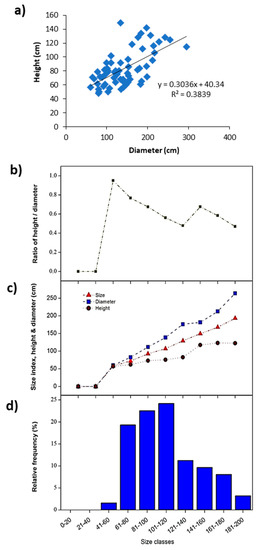 Size structure of Traganum nudatum. (a) Linear regression between diameter and height, (b) height/diameter ratio, (c) size index, and (d) relative frequency.