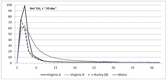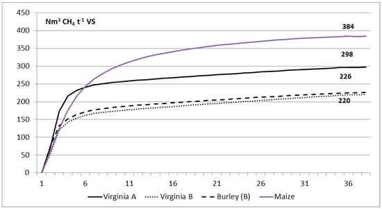 Some authors have cultivated energy crops in similar conditions as those presented in this study. Matyka and Księżak (2013) [] cultivated canary grass (Phalaris arundinacea L.) in the same experimental farm that cultivated the Virginia C and Burley tobacco presented in this study. Authors reported that ensiled canary grass can produce up to 273 Nm3CH4 t−1 VS. Kacprzak et al. (2012) [] reported that, on average, 389 Nm3CH4 t−1 VS can be produced from ensiled sorghum, while maize silage can produce 566 Nm3CH4 t−1 VS. Kacprzak et al. (2013) [] also tested canary grass and maize cultivated in the Osiny Experimental Farm for its biogas potential. They found that ensiled canary grass produced, on average, 187 Nm3 t−1 DM (dry matter) of CH4 while maize silage produced 208 Nm3 t−1 DM of CH4. Oleszek et al. (2014) [] found that biogas yield from canary grass, also cultivated in the Osiny Experimental Farm, can reach up to 406 Nm3 t−1 VS. This shows how varied are the outputs of studies on methane potential of different crops. In contrast, the tobacco silage tested in this study seems to be a rather poor substrate for methane production. Methane potential for tested tobacco varied between 220 to 298 Nm3CH4 t−1 VS (248 Nm3CH4 t−1 VS on average) (Table 3), and was lower than the methane potential of maize, which was tested during the same analysis as tobacco silage (Figure 1 and Figure 2). Li et al. (2019) [] tested four varieties of tobacco stalks for their methane potential and found that they can reach up to 132 Nm3CH4 t−1, which is less than half of the maximum methane potential of tobacco shown in the present study. The differences are probably due to the substrate; while Li et al. tested only tobacco stems (which are strongly lignified), the present study shows the methane potential of the whole tobacco plant. According to Weiland (2010) [], the optimal dry matter contents of plant substrates for ensilage should be 25% to 35%. The general quality of silage made of a substrate of TS (total solids) content below 25% can be poor and has high leachate formation, which results in slow fermentation and low methane yields. It is possible that tobacco harvested earlier, when plants are less lignified, would have better methane potential, but this still needs to be tested. The production of methane (Nm3 CH4·t−1 VS) from tobacco was at a level of 65% of what can be produced from maize (methane potential of maize was tested in the same conditions and at the same time as methane potential of tobacco,) (Table 5, Figure 2). Moreover, the calculated average yield of methane per hectare of tobacco (2847 Nm3 ha−1 yr−1 (Tabel 3)) was only half of calculated annual yields of methane of maize (5900 Nm3 ha−1yr−1, not showed in a table). Daily methane production from tobacco was as intensive, or even more rapid, as methane production from maize in the first four days of production. In the following days, methane potential of tobacco declined rapidly, while the decrease in methane production from maize was slower (Figure 1). Low methane production potential of tobacco, comparable to sunflower methane production in Weiland’s (2010) [] study, probably was due to a rather low dry matter content of the tobacco substrate. Moreover, the tobacco plants of the present study at the time of harvesting (October) were in large part lignified, which probably resulted in slow anaerobic decomposition of silage. This might also explain why methane production from tobacco was less efficient (compared to maize) especially at the later stages of methane production (Figure 1). Tobacco can contain more than a dozen (up to 20%) carbohydrates [,]. Probably, as a large part of those carbohydrates are easily digestible simple soluble sugars, the methane fermentation process of tobacco was most efficient at the initial stage of fermentation. With the depletion of simple substances, fermentation slowed down significantly (Figure 1).