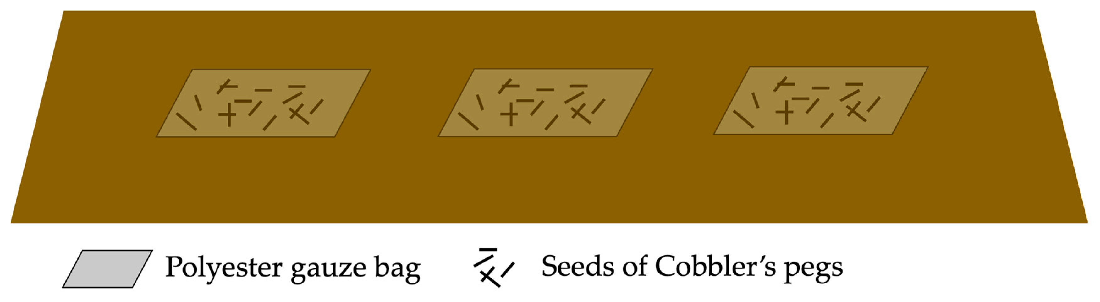 - Reddy, K.N.; Singh, M. Germination and emergence of hairy beggarticks (Bidens pilosa). Weed Sci. 1992, 40, 195–199. [Google Scholar] [CrossRef]