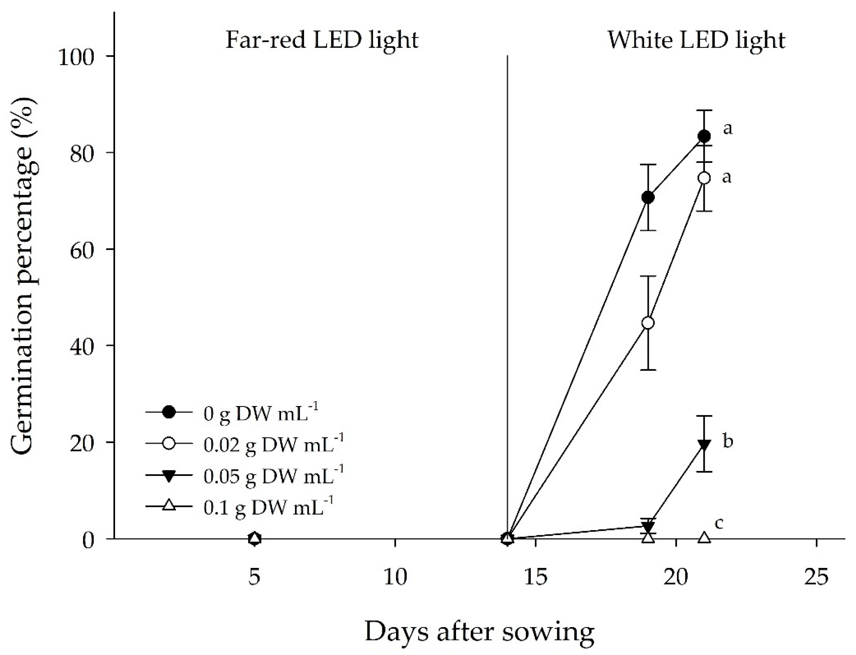 - Gallagher, R.S.; Cardina, J. Phytochrome-mediated Amaranthus germination II: Development of very low fluence sensitivity. Weed Sci. 1998, 46, 53–58. [Google Scholar] [CrossRef]