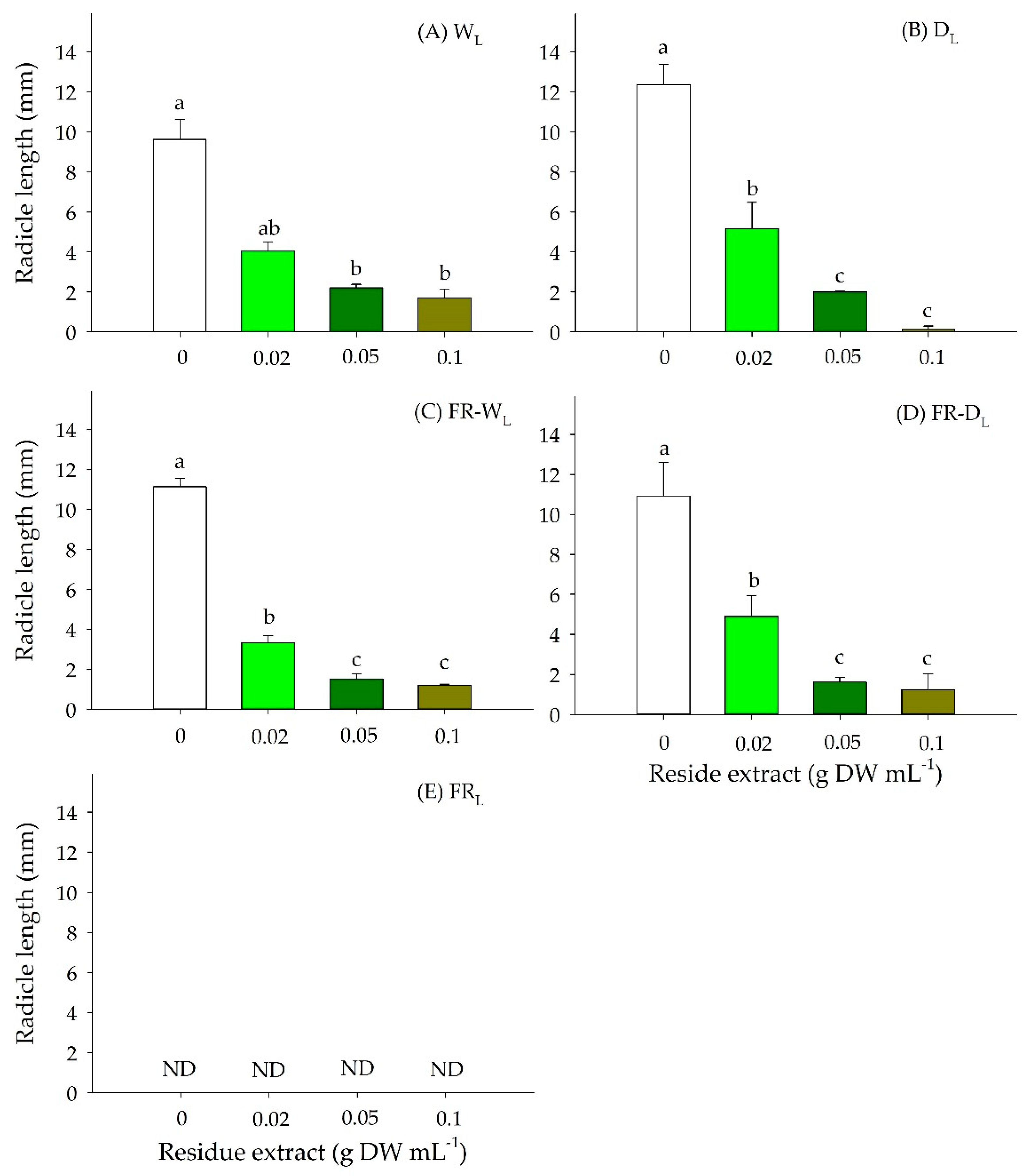 4.3. Autotoxic/Phytotoxic Effects of Residues on the Seed Germination and Radicle Growth