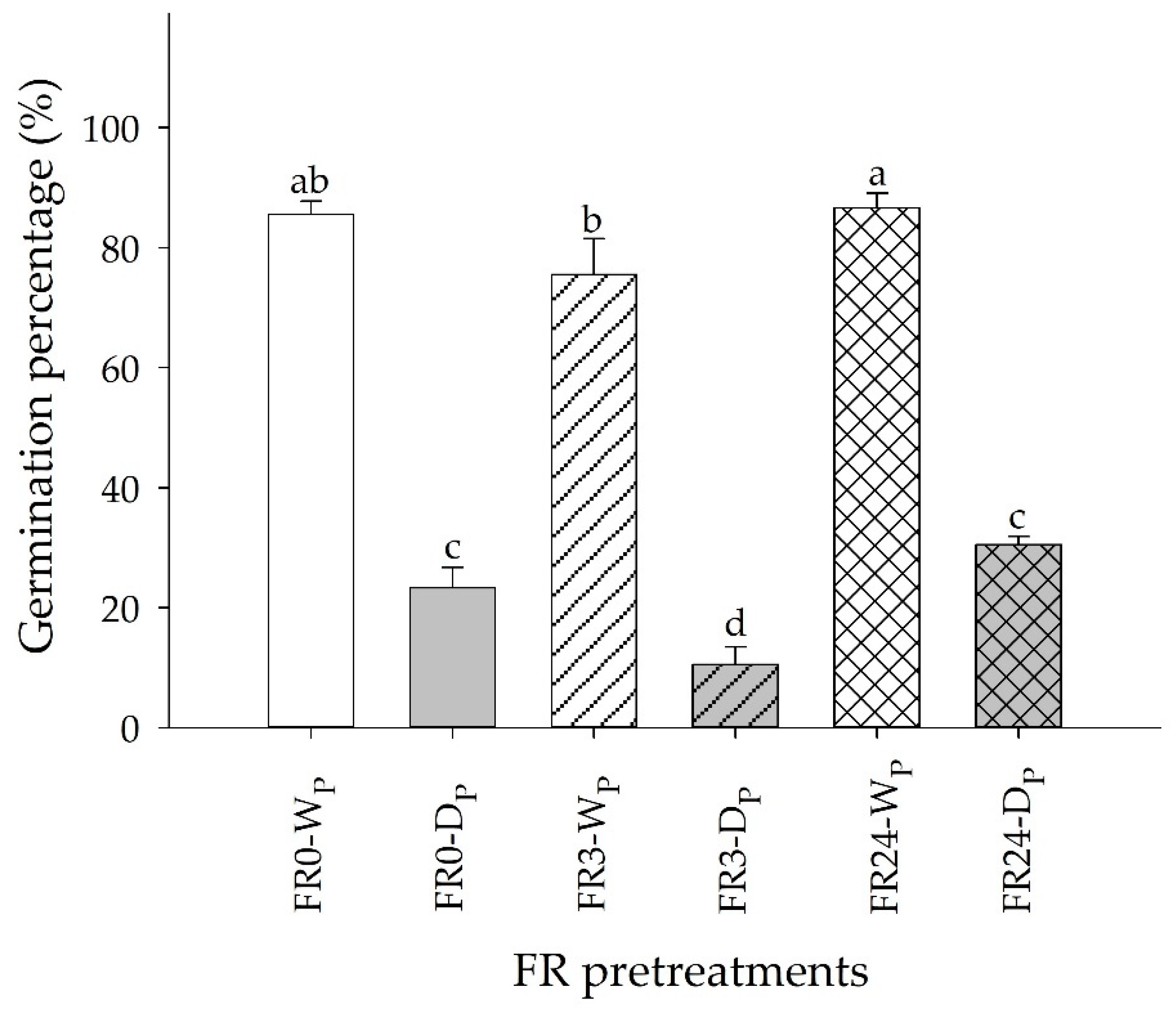 4.1.2. The Responses of Germination to Far-Red Light (FR) Pretreatments