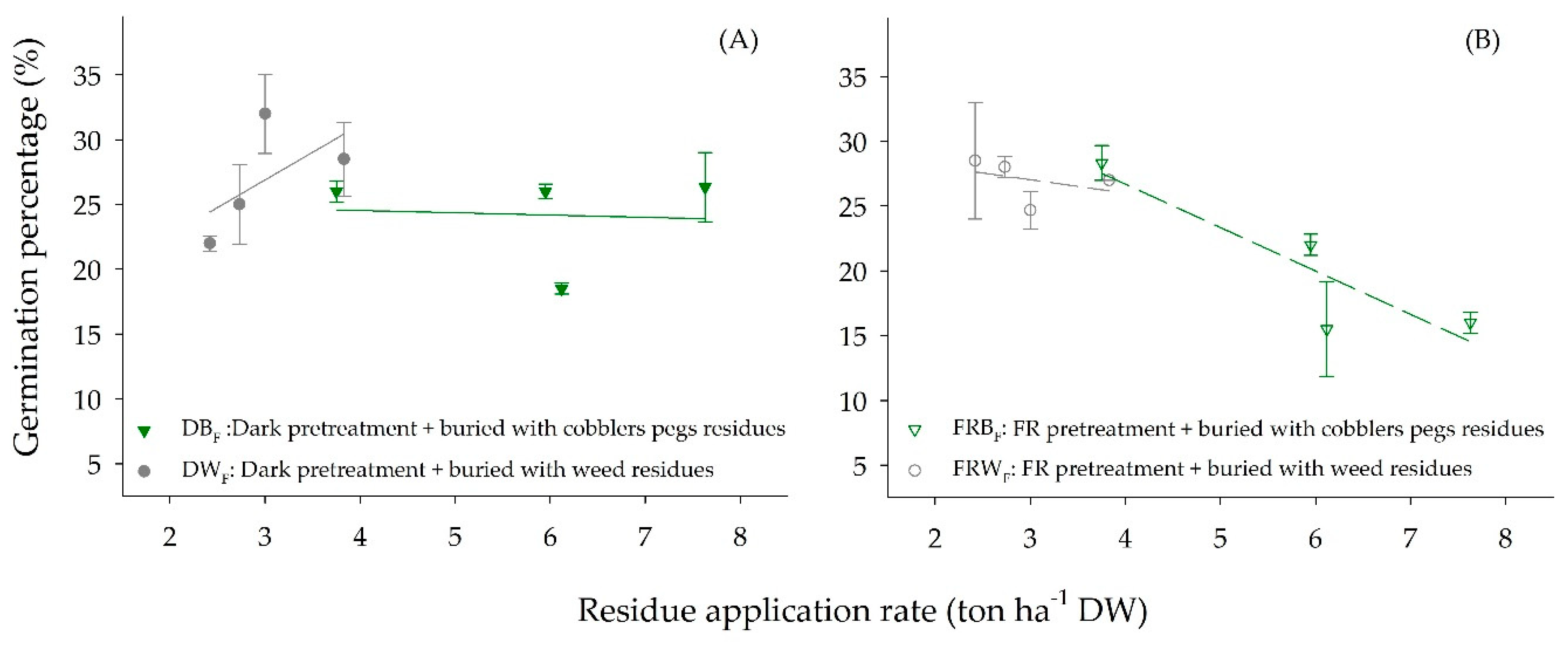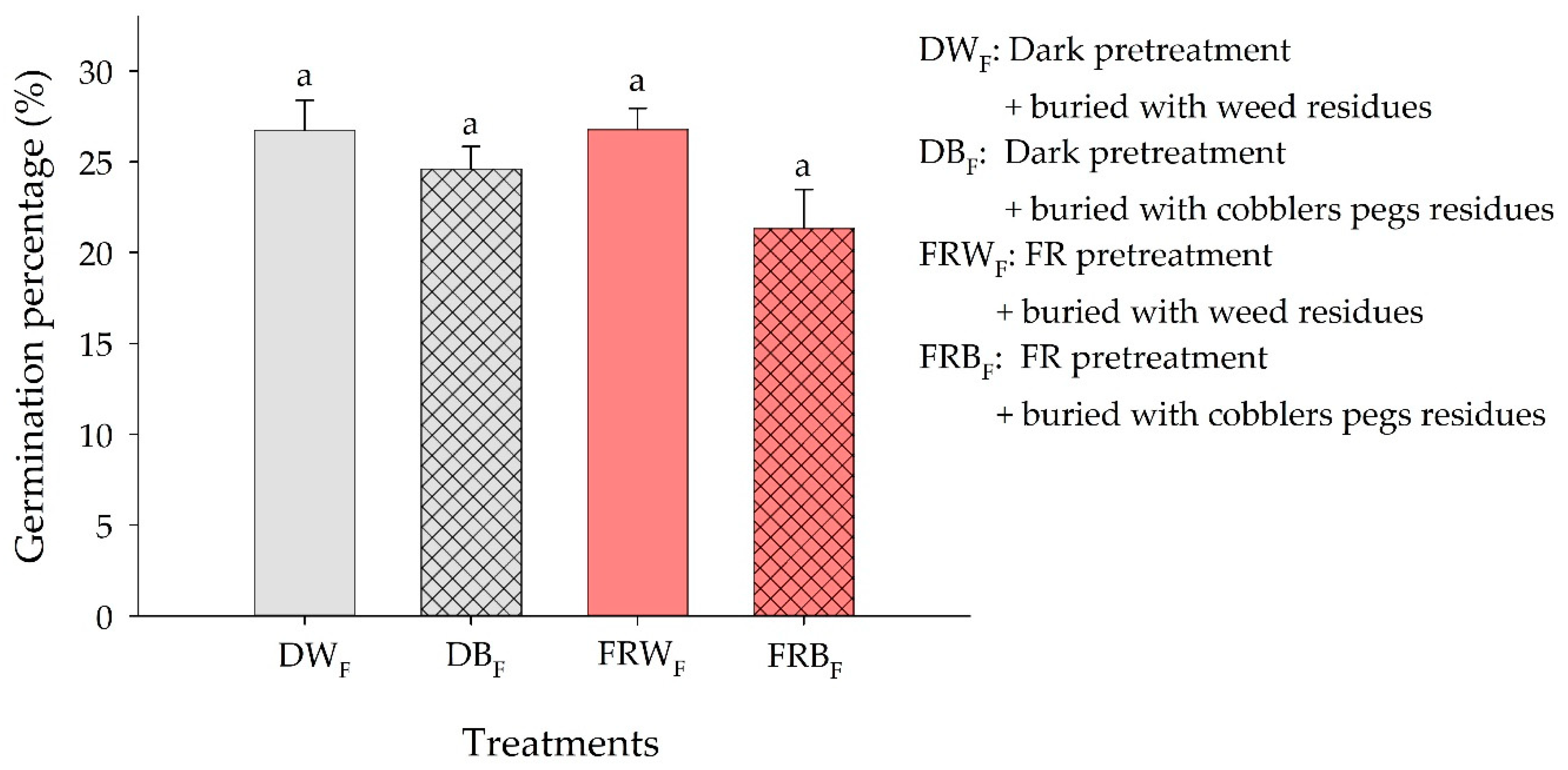 - Fenner, M. The inhibition of germination of Bidens pilosa seeds by leaf canopy shade in some natural vegetation types. New Phytol. 1980, 84, 95–101. [Google Scholar] [CrossRef]
