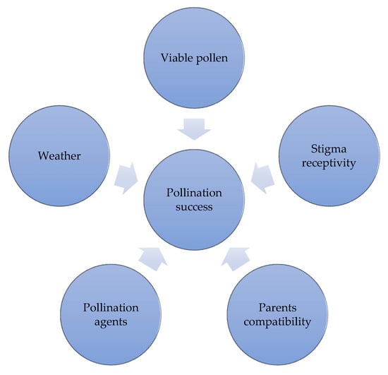 Pollination is the movement of pollen from the male sexual parts of a plant to the receptive surface of a plant’s female sexual parts []. Pollination is central to the transfer of genes in plant breeding. It involves three phases: the release of pollen, transfer of pollen, and placement of pollen (followed by germination) []. The pollination success is associated with many factors: pollen quantity and viability, stigma receptivity, cross compatibility, the efficiency of pollinator agents and the prevailing weather conditions [,] (Figure 1).
