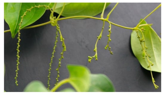 The male or female flowers are borne on axillary spikes (Figure 2). The male flowers are sessile, glabrous, and spherical and are borne axially or terminally. These flowers consist of a calyx of three sepals and a corolla of three petals, arranged regularly and almost similar in size and appearance, with three or six stamens [,]. The female flower is about 0.5 cm long; its ovary is trilocular with each locule having 2–3 ovules and located below the corolla [,]. The flowers of all Dioscorea spp. are entomophillous and are pollinated mainly by insects [,,]. Pistillate and staminate flowers allow a three-way slit of 100–200 µm, restricting visitations to only small insects (thrips). Insects involved in yam pollination in Nigeria were identified by Segnou et al. []. These belong to Coleoptera, Diptera, Hymenoptera, Hemiptera and Thysanoptera genera. Yam pollen grains are highly vacuolated, small, and sticky. The sticky nature of the yam pollen grains, with strong adherence to anthers, makes pollination by wind impossible []. Akoroda [] reported low viability of pollen from bisexual flowers on monoecious plants compared to pollen from unisexual flowers from dioecious plants of D. rotundata. The pollen remains viable for 4–5 h while the stigma is receptive up to 9–11 days after opening []. In open female flowers, stigma surfaces dry rapidly under direct sunlight, and flowers shaded by foliage usually set more fruits when pollinated than those in exposed positions. []. Fruit set is evidenced by an increase in ovary width to about 5 mm, 2–3 days after pollination, while fruit maturity is expected after 12 weeks [,].