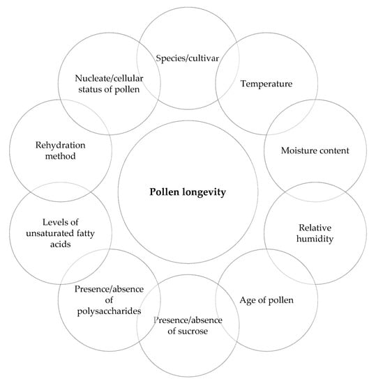 Past efforts in pollen storage for yam are simply observations made after storing pollen under what may be considered logical conditions without exploring factors affecting pollen longevity. As it has been the case on other crops, investigations should be conducted to determine factors linked to the longevity of stored pollen of yam. Several studies agree on the most critical factors or parameters affecting pollen longevity regardless of the species. These are either linked to the species’ intrinsic characteristics or environmental and handling factors [] (Figure 5). Basic parameters include the cultivar/species, initial water content, equilibrated (desiccated) water content, rehydration methods, and handling procedures []. Other factors include the presence or absence of sucrose and polysaccharide; these two confer greater longevity to pollen by protecting the membrane from desiccation or temperature stress [,]. The storage temperature is also a critical factor; low temperatures increase pollen longevity. Other factors to consider are the age or developmental stage at which the pollen is collected and levels of unsaturated fatty acids, these two factors shorten pollen shelf life. Brief, storing desiccated pollen under lower temperatures in an oxygen-free atmosphere improves longevity [,].