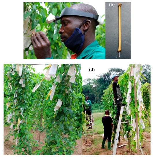 Some tools for increasing pollination efficiency in yam breeding. (a) Use of magnifying glass to ease the difficulty of handling tiny flowers, (b) adapted pin for transfer of anthers to stigma, (c) thrip-proof cloth-bags allowing passage of oxygen, (d) ladder to reach all flowers in taller yam plants.