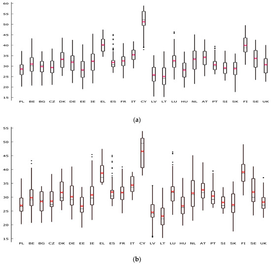 The integration analysis has been performed with the monthly raw milk prices in 2005–2018 and in two sub-periods; 2005–2011 and 2012–2018. The sub-periods were selected based on the time series analysis and a considerable decrease in the milk price differences in Poland when compared with the milk prices in the EU countries after 2011. Price logarithms were included in the calculations. It is a common practice in this type of analysis [1,3,4,9]. The data at the country level has been derived from the Milk Market Observatory [10]. With the preliminary time series analysis, next to Poland, another 24 countries were selected; following the decreasing milk production, they were (Figure 1): Germany (DE), France (FR), the United Kingdom of Great Britain and Northern Ireland (UK), Italy (IT), the Netherlands (NL), Spain (ES), Ireland (IE), Denmark (DK), Belgium (BE), Austria (AT), the Czech Republic (CZ), Sweden (SE), Finland (FI), Portugal (PT), Hungary (HU), Greece (EL), Lithuania (LT), Bulgaria (BG), Latvia (LV), Slovakia (SK), Estonia (EE), Slovenia (SI), Luxemburg (LU) and Cyprus (CY). In 2018 the total amount of milk produced in the EU was 168.4 million tons and it was 10% higher than in 2005.