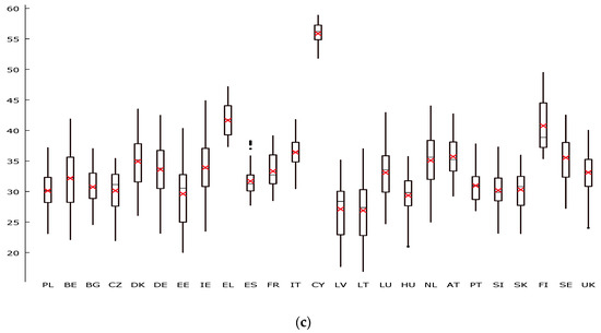 Basic raw milk price characteristics across the countries (EUR/100 kg): (a) in 2005–2018, (b) in 2005–2011, (c) in 2012–2018. Source: own calculations [10].